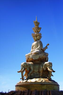 When I visited Chengdu, China, it was pretty much buried in a permanent hazy smog. We travelled outside of Chengdu to the Buddhist holy mountain of Emei Shan to stay, and one gorgeous day we broke through the seemingly permanent clouds to see the temples and the statue of Pu Xian, gleaming in the sun against a sky we hadn't seen in days. Easy to see why Emei Shan is considered holy.